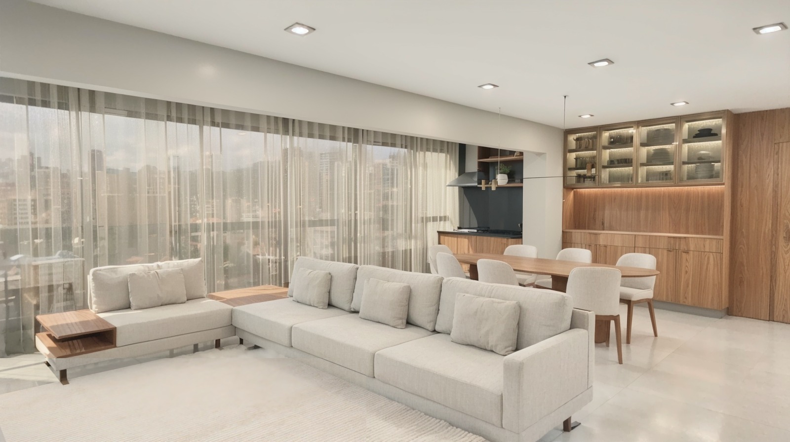 Projeto de móveis planejados para living integrado, conectando sala de estar, jantar e área gourmet em um ambiente amplo, elegante e pensado para receber com conforto.