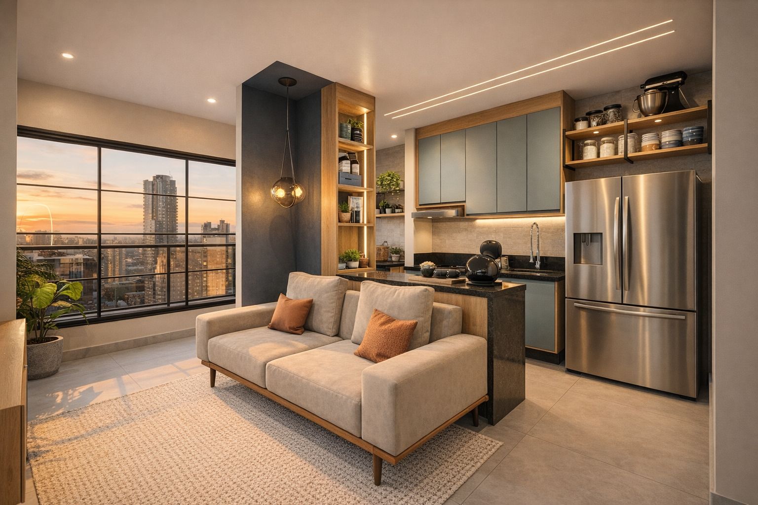 Projeto de móveis planejados para ambiente integrado, unindo cozinha e sala de estar com soluções sob medida que valorizam o espaço, a iluminação natural e a funcionalidade do dia a dia.