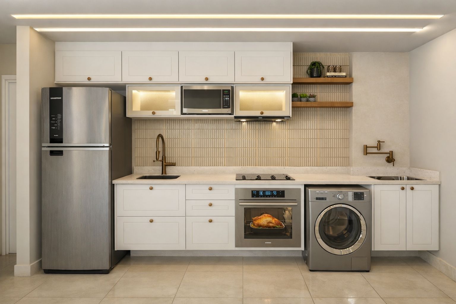 Projeto de móveis planejados que integra cozinha e área de serviço, com soluções sob medida que unem funcionalidade, organização e design moderno.