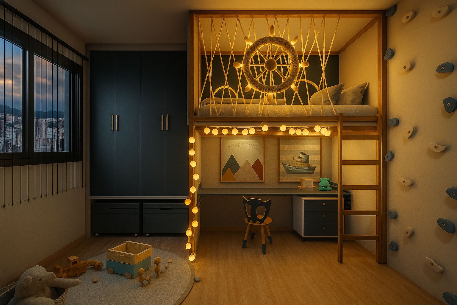 Projeto de quarto infantil planejado com móveis sob medida, que combina área de descanso, estudo e brincadeira em um ambiente criativo, funcional e pensado para acompanhar o crescimento da criança.